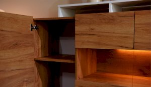 Красивый и практичный комод Невио - 2 обладает целым рядом преимуществ. Благодаря оригинальным открытым и закрытым полкам, отсутствию лицевой фурнитуры создает ощущение легкости и невесомости. Высота фасадов увеличена на 1 см для удобства открывания. С помощью витрины из прозрачного стекла Вы можете украсить свой дом милыми сердцу вещами и сделать на них акцент с помощью светодиодной подсветки. Задняя стенка витрины выполнена из ЛДСП в цвет корпуса, поэтому не будет отвлекать на себя внимание от наполнения витрины. Мебель выполнена из высококачественных экологичных материалов