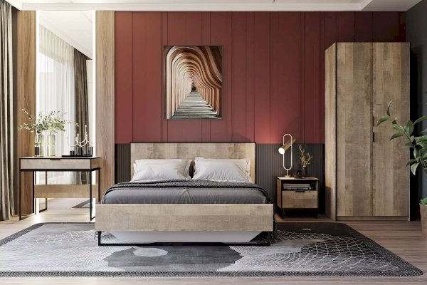 Кровать из коллекции ФОЛК легко впишется в интерьер спальни в стиле Лофт, придав ей современный и монументальный вид. Черные металлические опоры дополняют и подчеркивают оригинальный дизайн мебели, а черная кромка эффектно выделяет фасад изделия.