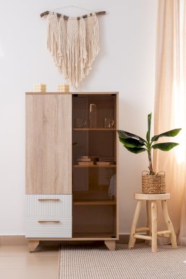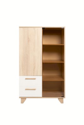 Стеллаж со стеклом — это практичное и дизайнерское решение для гостиной. Стеллаж имеет семь полок и два ящика. Ящики оснащены шариковыми направляющими полного выдвижения. Створки выполнены из ЛДСП и стекла, что позволяет хранить как необходимые предметы, так и предметы декора.