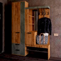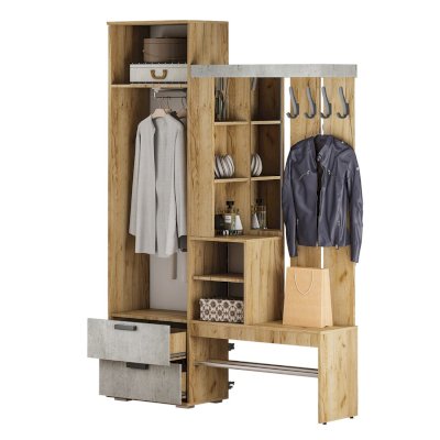 Идеальный выбор для современного интерьера, особенно в стиле лофт, – это прихожая Трамп. Модель выполнена из ЛДСП двух цветов – крафт и бетон. Изделие имеет все необходимые зоны для размещения вещей в прихожей: крючки для верхней одежды, открытые и закрытые ниши, шкаф с выдвижной штангой и зону для хранения обуви.