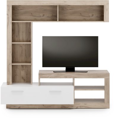 Открытая часть со стеллажом крепится к стене при помощи регулируемых навесов Scarpi. Обратите внимание! Изделие собирается только так, как изображено на фотографиях. Практичное решение по лучшей цене — это гостиная Омаха