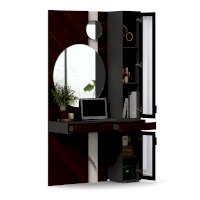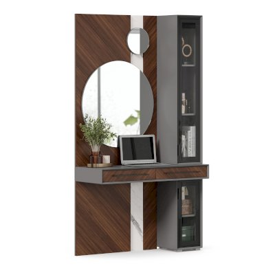 • Модуль скомбинирован из наборной панели с зеркалами, шкафа одностворчатого и стола с выдвижными ящиками