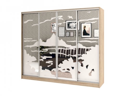 Данное изображение представлено в следующих цветах: корпус - Дуб Сонома, фасады - зеркало с пескоструйным рисунком, рамка двери и треки - Серебро матовое.