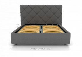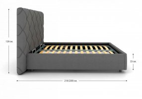 Изысканная и элегантная интерьерная кровать. В комплект входит кроватное основание. При необходимости кровать может снабжаться подъемным механизмом с бельевым ящиком.