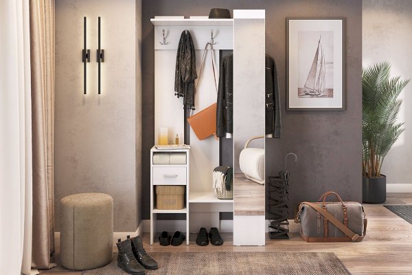 «Агата» создана для Вашей прихожей – Вы можете повесить одежду и сумку на металлические крючки, шляпки положить на полку сверху, нужные мелочи – в выдвижной ящик. На открытых полках можно разместить зонты, перчатки и шарфы. Лицевая панель с зеркалом во весь рост обеспечит комфорт и уют Вашей прихожей. «Агата» - стильная, функциональная, занимает минимум пространства.
