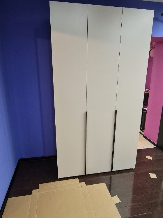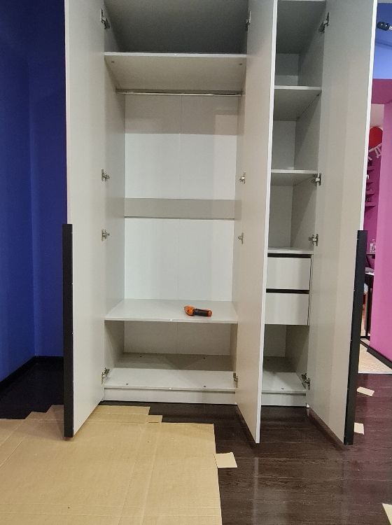 хороший шкаф, нареканий нет, немного неуобно было собирать одному человеку из за скрытого крепления полок
