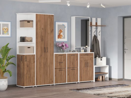 Шкаф идеально подходит для завершения модельного ряда как с левой так и с правой стороны. В верхней части шкафа находится секция с полками, в нижней полки за закрытыми фасадами. Может быть использован как дополнительный модуль ПР-7 или как самостоятельное изделие.