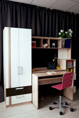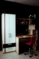 • Шкаф снабжен торцевым вешалом для одежды на плечиках и полку над ним + 2 выдвижных ящика.