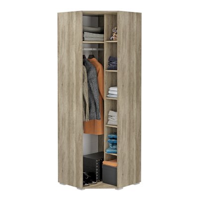 С умом использовать пространство поможет угловая модель шкафа Наоми из одноименной модульной серии. Изделие выполнено из ЛДСП, фасад распашной дверцы состоит из МДФ и имеет встроенную ручку. Внутри шкаф разделен на две зоны для размещения одежды на вешалках и хранения сложенных вещей на полках.