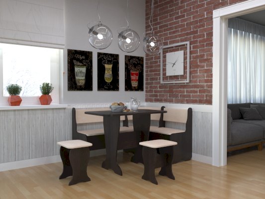 Кухонный уголок станет отличным приобретением для кухни или столовой зоны. В комплекте скамья угловая, стол и два табурета. Сиденья в обоих частях скамьи открываются, под ними ящики для хранения кухонных принадлежностей.