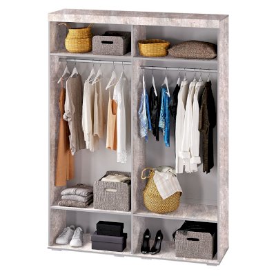 Современный четырёхстворчатый шкаф Инстайл выполнен в стиле одноименной модульной коллекции мебели. Модель состоит из четырех дверок, две из которых – зеркальные. Изделие выполнено в комбинации белого и цвета бетон. Внутреннее наполнение состоит из двух отделений со штангами, а также верхних и нижних полок для вещей. Стильный геометрические ручки украшают шкаф Инстайл.