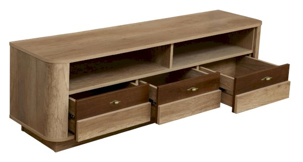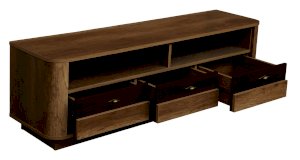 Тумба предназначена под ТВ либо любую другую технику. На верхней панели можно расположить очень многое: телевизор, стереосистему, проигрыватель. Под столешницей находятся два открытых отсека, а под ними – три закрытых выдвижных ящика. Внешне применен принцип асимметрии: три ящика под двумя полками. Такой прием делает дизайн более интересным и нестереотипным.