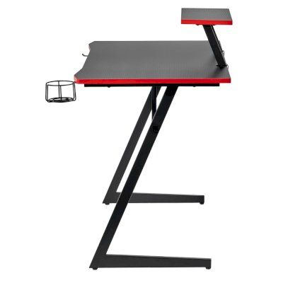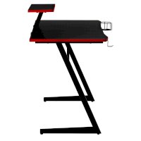 Конструкция простая и прочная: стальная рама выдержит серьезную нагрузку (заявлено до 200 кг). Стол на двух L-образных опорах впишется в любой уголок дома, его легко перемещать, удобно собирать и разбирать. Несмотря на лаконичность дизайна, он очень стильно смотрится: строгая черная столешница «под карбон» отделана красной кромкой.