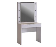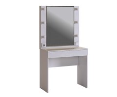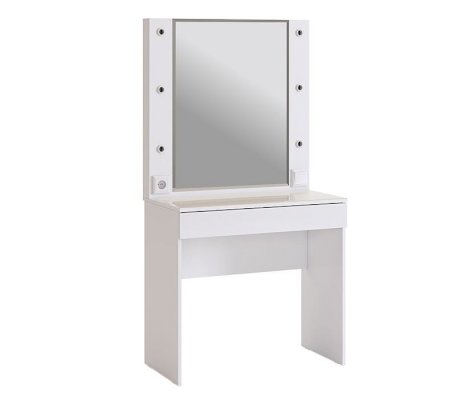 Трендовое трюмо из серии «Гламур». В зеркало с широким фацетом, встроена подсветка, как в столах профессиональных визажистов. Дополнительно имеется выключатель, розетка для фена и выдвижной ящик для украшений и косметики. Украшение трюмо - белый глянцевый фасад ящика.  Стеклянная столешница трюмо с фацетом по периметру и противоосколочной пленкой, легка в уборке.