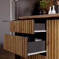 Универсальный дизайн кухни "Шерлок" легко адаптируется под различные интерьерные решения. Фотопечать "рейки" создает иллюзию фактурности. Высокие ножки позволяют без труда поддерживать чистоту на кухне с помощью робота-пылесоса.