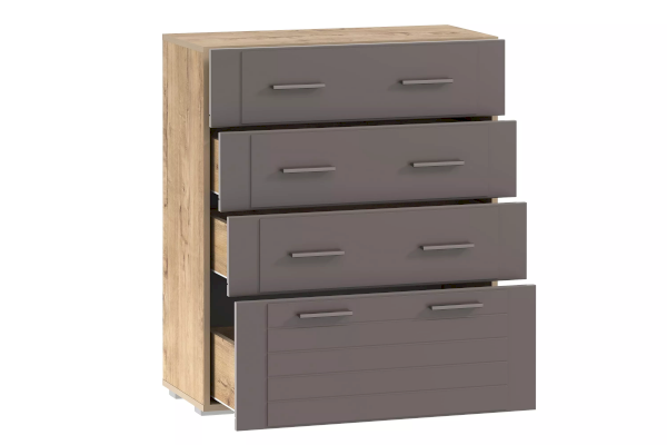 Комод Livorno НМ 040.46 идеально впишется в интерьер современной гостиной или спальни. Модуль оснащен четырьмя вместительными ящиками, плавный ход которых обеспечивают шариковые направляющие полного выдвижения. Верхние ящики меньше нижнего, поэтому подходят для хранения более легких вещей. На фасадах предусмотрено по две ручки, что обеспечивает максимально удобное открывание ящиков.