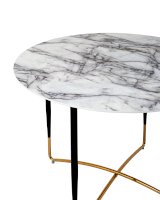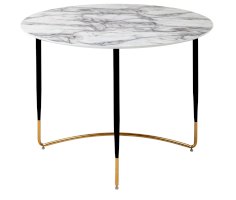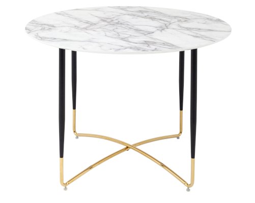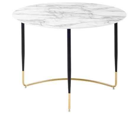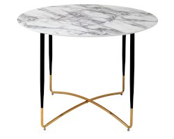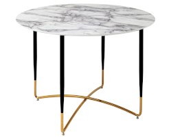 Стильный обеденный стол с рисунком белого мрамора. Круглая столешница выполнена из МДФ - прочный, экологически безопасный материал, устойчив к перепадам температур и повышенной влажности. Поверхность столешницы декорирована под белый мрамор, который лаконично сочетается с золотыми ножками. Дизайн стола дополнит интерьер кухни, зала с любыми комплектами стульев в современном стиле.