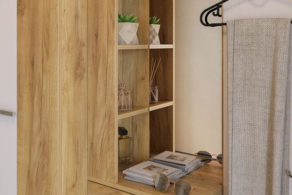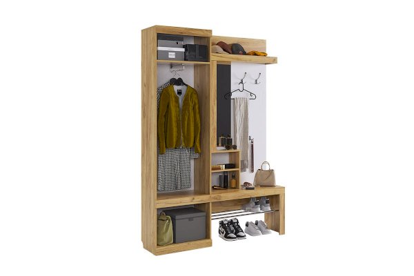 «Алекс» - прихожая 3 в 1. Это открытые ниши для размещения одежды, сумок на металлические крючки и модное решение из хромированных трубок для хранения повседневной обуви.  Закрытый шкаф-гардероб для несезонной обуви и верхней одежды на плечиках. А так же ниша-трюмо с зеркалом и полками сбоку станут незаменимыми помощниками в наведении  утреннего марафета. В закрытом шкафу под зеркалом можно хранить средства для чистки обуви, фен и другие нужные вещи. Прихожая «Алекс» - в ней поместится ВСЕ и даже Больше!