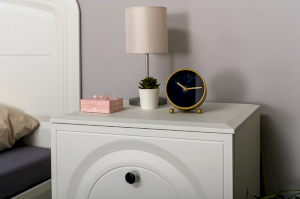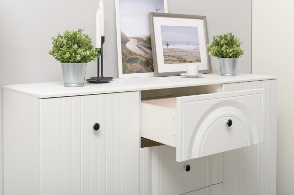 Основным декоративным элементом коллекции является круг. Явно представленный фрезеровкой по фасадам тумбы, комода, в изголовье кровати и ручках-кнопках.