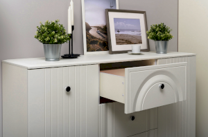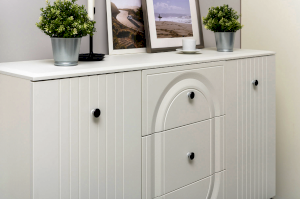 Вся лицевая фурнитура металлическая, графичное и стильное сочетание черного и хромированных деталей эффектно расставляет акценты на мебели.