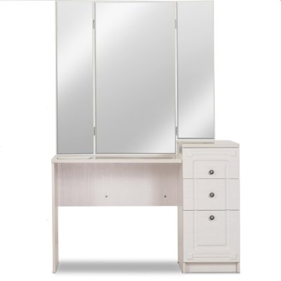 Самое первое - несоответствие цвета. В карточке товара и на фото указан белый, по факту это не так. Стол заказывался под остальную белую мебель, теперь придется искать решение. Второе - неотработанный край лдсп на центральном зеркале. Это некрасиво и бросается в глаза.