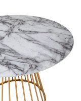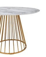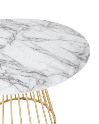 Стильный стол с металлическим основанием. Круглая столешница с рисунком белого мрамора выполнена из МДФ - прочного, экологически безопасного материала, который устойчив к перепадам температур и повышенной влажности. Поверхность столешницы декорирована рисунком белого мрамора, который идеально сочетается с металлическим основанием в золотом цвете. Защитные подпятники в основании предотвращают порчу напольного покрытия.