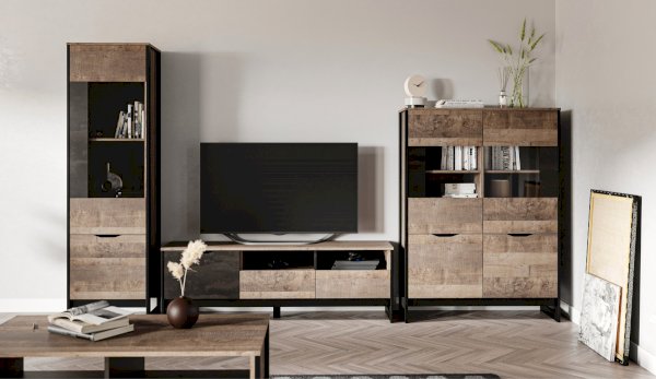 Функциональная тумба для TV и аудио аппаратуры оснащена двумя ящиками на телескопических направляющих, закрытыми и открытыми полками для хранения сопутствующих аксессуаров. Отсутствие лицевой фурнитуры подчеркивает минимализм и геометрию модуля. Особенность дизайна – это сочетание реалистичных по цвету и тактильности трендовых декоров, которые соответствуют последним городским тенденциям. «Дуб Гранж» привлекает имитацией вручную обработанного дерева и выразительной зернистой текстурой, характерной формой досок. Стильный серый цвет «Железного камня» с металлическими разводами и новая текстура состаренной штукатурки в сочетании с гладкостью металла вносят индустриальныи? колорит. Оригинальные ножки-опоры из МДФ контрастного цвета придают изюминку интерьеру.