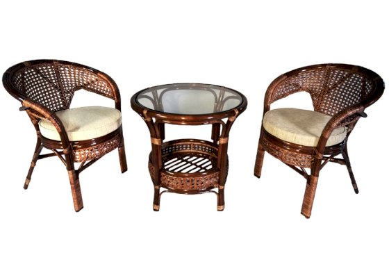 Комплект мебели Пеланги 02/15 включает в себя: 2 кресла и столик с красивым плетением снизу и полочкой, съемные подушки из материала улучшенного качества.