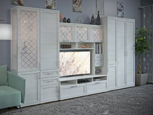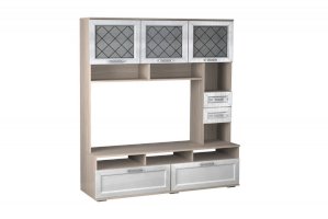 Помимо привлекательного дизайна, тумба под ТВ может похвастаться отличной функциональностью. Она имеет два вместительных ящика и два маленьких, открытые ниши под тв аппаратуру и полки под декор. Дверки со стеклом с пескоструйным рисунком добавляют модели легкость. Таким образом, тумба под ТВ при достаточно компактных размерах имеет множество мест для хранения. Это идеальный вариант для небольших гостиных.