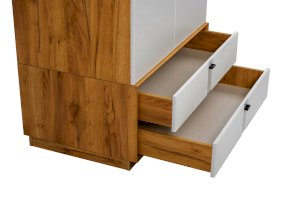 • Шкаф разделен на 2 отделения: нижнее с двумя ящиками друг под другом на направляющих нижнего крепления не полного выдвижения с доводчиком