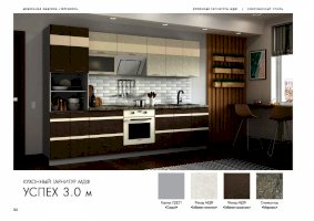 Стараетесь окружить себя и своих близких самыми лучшими вещами? Выберите кухонный гарнитур «Успех»! Стильная и модная мебель станет украшением вашего дома. Ее отличают гладкие фасады и неброская фурнитура. Эффект эксклюзивности и престижности достигается с помощью элегантной комбинации нескольких цветов. Для оформления одного комплекта могут использоваться целых три оттенка. Например, шампань, жемчуг и платина.