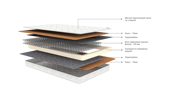Наполнитель: ППУ, зависимый пружинный блок Bonnel, термовойлок, кокос