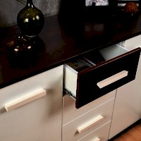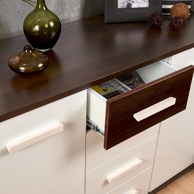 Стильная Норвуд 5 Тумба МЦН отвечает требованиям скандинавского стиля. Яркие акценты тумбы - контрастные горизонтальные детали толщиной 22 мм и фасад верхнего ящика в декоре Орех Шоколадный. Четыре выдвижных ящика на шариковых направляющих, две распашные дверцы по бокам легко и удобно открываются за светлые ручки из массива. Регулируемые опоры компенсируют неровности пола.