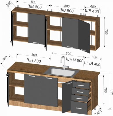 Шкаф нижний (с ящиками): 400х830х450 мм