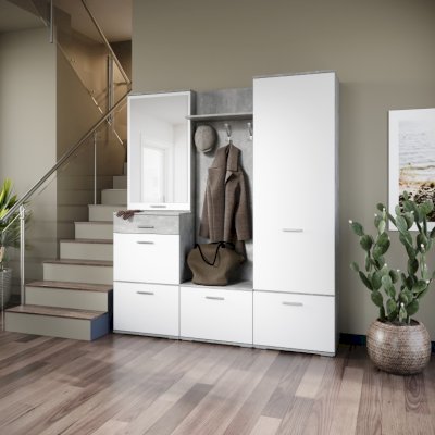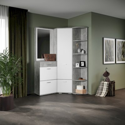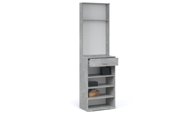 Функциональный модуль вмещает в себя зеркало-шкаф и обувницу с выдвижным ящиком на телескопических направляющих. Зеркало зрительно увеличивает пространство и количество отражённого света, полки за распашным фасадом поместят необходимые вещи – косметику, расчески. Компактная обувница удобна для хранения сезонной и домашней обуви, а выдвижной ящик для ключей или документов. Идеально компонуется со всеми модулями системы Виола.