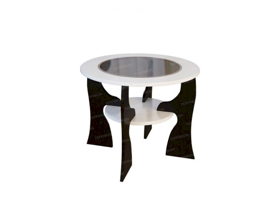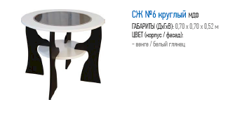 Небольшой журнальный столик №6 — это стильный и броский предмет обстановки. Необычным и запоминающимся его делают ножки необычной конфигурации и привлекающее внимание сочетание двух контрастных цветов: ослепительного белого глянца и темно-коричневого венге. Благодаря круглой форме он занимает минимум места и может использоваться даже в весьма тесных помещениях.
