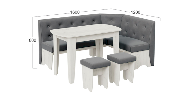 Декоративные накладки, установленные по бокам скамьи, и пуговки на спинке, подчеркивают элегантный дизайн этой обеденной группы, которая, несомненно, станет изюминкой в любой кухне. Разнообразие актуальных цветовых исполнений позволяет приобрести модель исходя из индивидуальных предпочтений каждого потребителя, подобрав мебель на любой вкус и цвет.