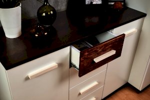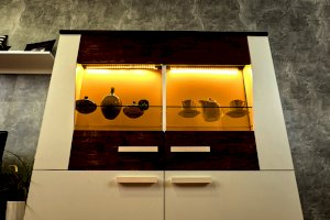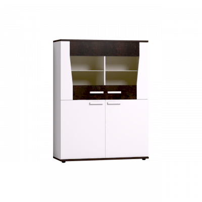 Фигурный фасад витрины модуля Норвуд 22 Шкаф-сервант эффектно совмещает в себе стекло, ЛДСП и брашированную деревянную вставку. Тонированные стекла фасадов прекрасно подчеркивают материал брашированных вставок.
