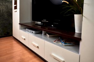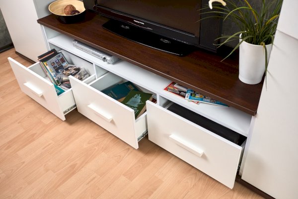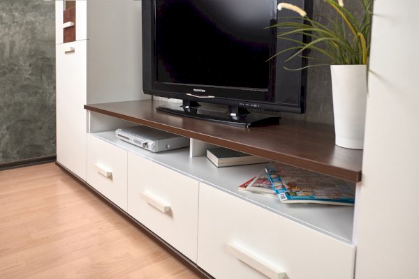 Основной декор гостиной НОРВУД — белый. Именно он отвечает за визуальное расширение пространства и освещение. Контрастные горизонтальные поверхности толщиной 22 мм в декоре Орех Шоколадный разбавляют белые фасады модулей.