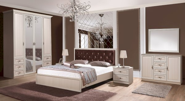 Кровать из серии Габриэлла. Изголовье кровати обшито велюром.