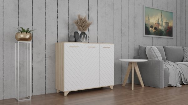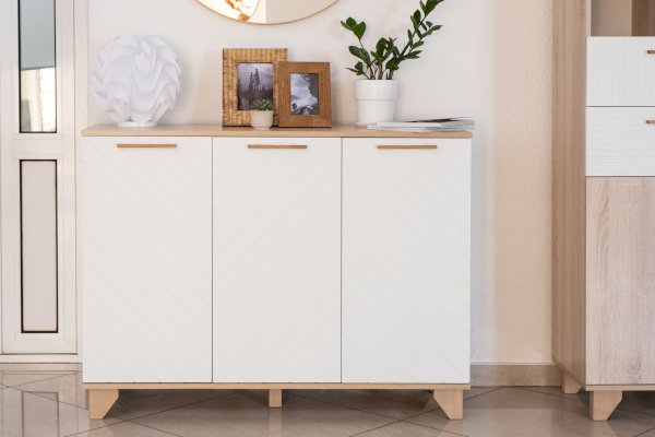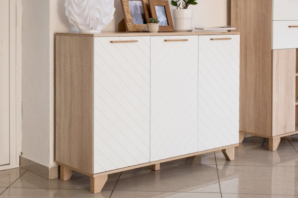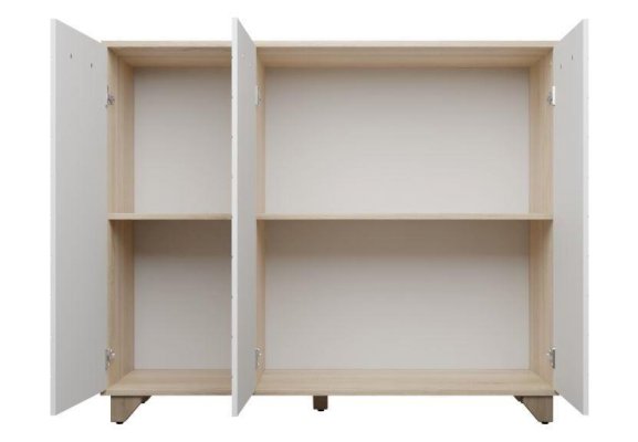 Трехстворчатый комод Стокгольм оборудован закрытыми полками. Подходит для хранения предметов одежды и текстиля. Створки крепятся на петли с доводчиками, что обеспечивает плавность хода при открывании и закрывании. Ручки выполнены из натурального массива дуба. Опоры из массива сосны имеют регулировку по высоте. Разные сочетания цветов корпуса и фасада изделия позволят выбрать подходящую модель для любого интерьера.