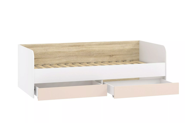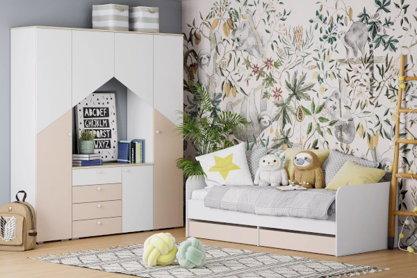 Вместительные бельевые ящики удобны для хранения постельных принадлежностей. Боковая спинка предотвращает истирание настенного покрытия. Кровать полностью безопасна для ребенка: у модели нет острых углов и накладных ручек на фасадах ящиков.
