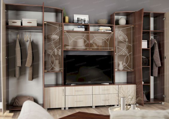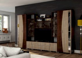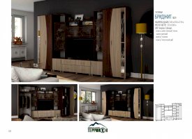 Артистичные, возвышенные натуры захотят приобрести гостиную «Бриджит». Ведь несмотря на крупные габариты, этот комплект мебели кажется изящным и невесомым. Ощущение легкости привносят в обстановку светлые оттенки, а также элементы из стекла и зеркал. Эффект устремленности вверх усиливают абстрактные рисунки, состоящие из тонких плавных линий.
