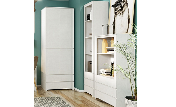 Двухдверный компактный шкаф Твист для одежды, оснащенный штангой и рядом полок. Нейтральный молочный цвет фасада оживляется геометричной фрезеровкой  на фасадах.