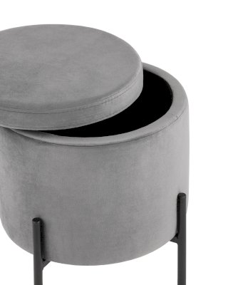 Лаконичный круглый пуф на металлических ножках. Мягкая обивка выполнена из износостойкого велюра, тактильно приятный и долговечный материал. Металлические ножки черного цвета высотой 13 см. выдерживают нагрузку до 80 кг. Подпятники в основании ножек делают пуф более устойчивым и предотвращают скольжение. Под сидением имеется ящик для хранения мелочей, крышка полностью съемная. Пуфик станет отличным дополнением для спальни, прихожей или зала.