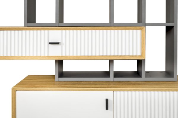 • На тумбу ТВ опирается вертикальный открытый стеллаж с полками, в который установлен стол-консоль с опорными ножками ППУ с одной стороны.