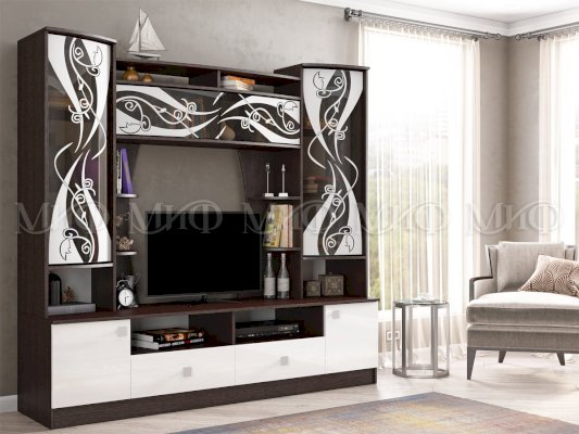Белая гостиная из МДФ. Яркое решение для гостиной комнаты. Стеклянные дверцы верхних фасадов за счет их декорирования матовым рисунком, выглядят стильно и практично. Гостиные со стеклом - хорошая возможность создать уникальный интерьер.