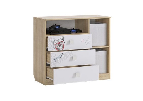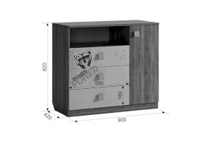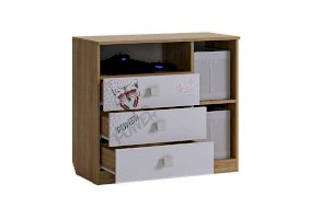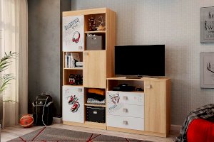 3 выкатных ящика, ниша и закрытые полки, все что нужно что бы разместить вещи вашего ребенка.  Эффектный принтерный рисунок на фасадах выдержан в общем стилистическом решении. Рисунок устойчив к истиранию и ультрафиолету. Открытая ниша для гаджетов, столешница толщиной 25 мм, на которой с легкостью поместиться большой телевизор.