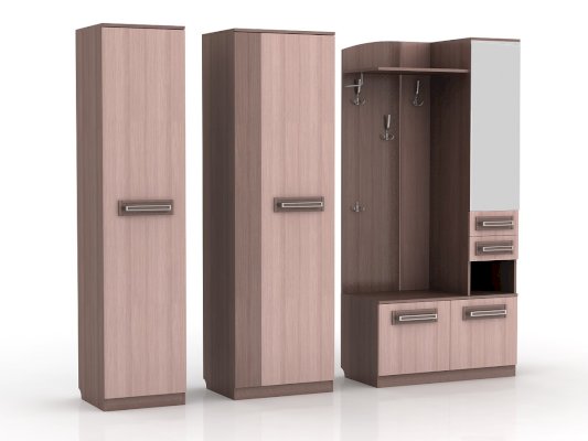 Венге/ Липа Светлана Отличительные особенности прихожей — функциональный дизайн и современные оттенки текстур. Конструкция данной модели включает в себя все необходимое: зеркало, шкаф, пенал, вешалки, ящики и множество полок для различных мелочей.