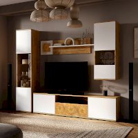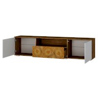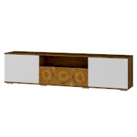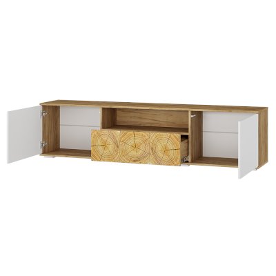 Тумба под ТВ  из коллекции «Тиволи» сочетает три функциональных зоны для хранения: вместительный ящик, открытую узкую полку и еще две просторных полки, скрытых за дверцами. Яркий штрих модели - стильные вставки, стилизованные под спил дерева. Тумба  отлично дополнит гостиную, на ней можно разместить телевизор и приставку, а также небольшую технику и колонку.